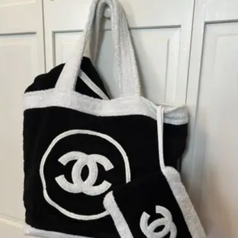 Juego de bolso de playa y toalla Chanel Terry Cottony CC en blanco y negro. La bolsa presenta correas de hombro de algodón terry blanco, se abre a un interior blanco con una bolsa extraíble y una toalla de playa. ¡Es la bolsa de playa perfecta para el verano!