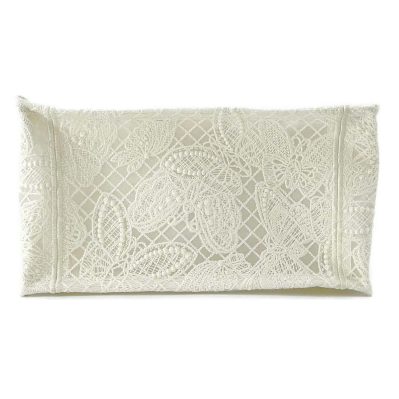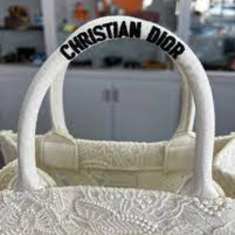Este bolso de Christian Dior presenta un encantador diseño de bordado de mariposa en un material de lona blanca.