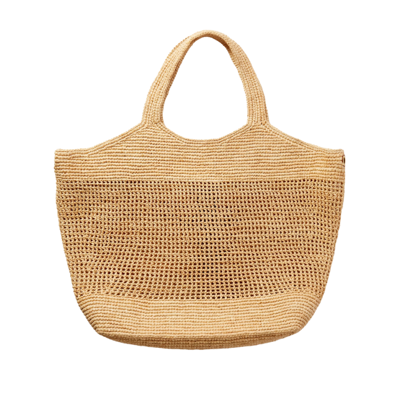 Maxibolso shopper de croché de rafia natural y piel de curtido vegetal vintage, decorado con Cassandre oversize confeccionado a mano.